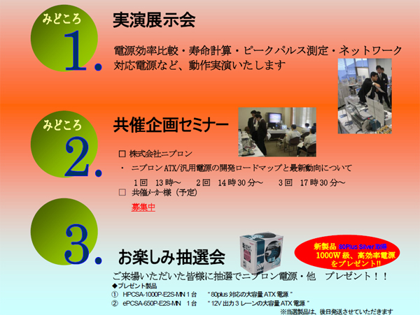 平素はご愛顧いただき誠にありがとうございます。 来る平成23年10月26日(水)、10月27日(木)府中グリーンプラザ本館において「府中de電源展」を開催致します。 電源の付加価値を視覚化した実演デモや共催企画セミナー・ニプロン初!80PlusSilver対応のPeak1000W ATX電源「HPCSA-1000P-E2S」等が当たるお楽しみ抽選会を実施致します。 ご多忙中とは存じますが、是非ともご来場賜りますようお願い申し上げます。 ご来場ご希望の方は下記フォームよりお申し込みいただきますようよろしくお願い致します。