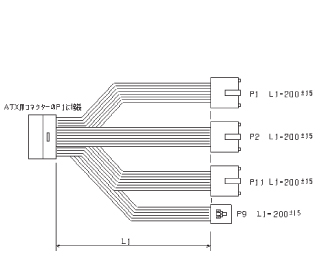 弊社ATX電源をATコネクタのマザーボードに使用する場合、ATX→AT変換コネクタ(弊社型式WH5055(PS5055))を使用します。接続方法は下図のとおりです。 ATX出力の電源では、メインの20Pinコネクタ(右の図ではP1)がマザーボードに接続するコネクタです。 ATのマザーボードに接続する場合、この20PinのメインのコネクタにATX→AT変換コネクタを使用します。 ATX出力の電源では、メインの20Pinコネクタ(右の図ではP1)がマザーボードに接続するコネクタです。 ATのマザーボードに接続する場合、この20PinのメインのコネクタにATX→AT変換コネクタを使用します。 ![]() 図4 ATXコネクタ ATX→AT 変換コネクタWH5055(PS5055)は右図のとおりです。一方をATX電源のメイン20Pinコネクタに接続し、P1,P2をATマザーボードに接続します。 なお、 ATX電源のリモートによるON/OFFを実現するため、P9のON/OFF端子とCOMにスイッチを接続する必要があります。 常に電源をON状態にする ためにはON/OFF端子とCOMをショートさせておきます。 ![]() 図5 変換コネクタ |