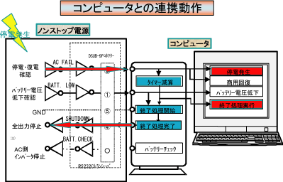 ノンストップ電源(NSP7シリーズは除く)のインタフェース条件は以下のとおりとなっております。 ノンストップ電源監視用ソフトを開発する際にご参照ください。 なお、弊社ノンストップ電源はWindows NT標準の無停電電源監視サービスのインタフェースと同様にしています。 ノンストップ電源からのPCへの信号 ![]() 表12 ノンストップ電源からのPCへの信号(PCへの入力) ![]() 表13 PCからのノンストップ電源への信号(PCへの入力) PCとノンストップ電源を連係させるためには、次の動作が必要になります。 1)停電が発生すると、ノンストップ電源よりPCに対してAC入力低下検出=負が通知される。 2)PCは1)の信号を受けて停電復旧待ちのタイマーをスタートする。 3)停電復旧待ち時間内に停電が復旧した場合は通常動作にもどる。 4)停電復旧待ち時間を経過した場合はアプリケーション、OSのシャットダウンを行う。 5)停電復旧待ち時間内にノンストップ電源よりPCに対してDC入力低下検出=負が通知された場合は遅滞なく4)と同様の動作を行う。 6)PCの電源をOFFして良い時点でPCよりノンストップ電源に対して全DC出力強制OFF=正を入力する。 ※PCの電源をOFFして良い時点で信号を制御できない場合は、APM(Advanced Power Management)による電源停止(ATXのソフトOFF)とする。 概略イメージは以下の図の通りとなります。 ![]() 図13 コンピュータとの連動動作 |