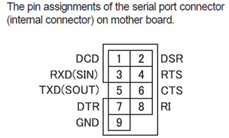 The pin assignments of the serial port connector(internal connector) on mother board.