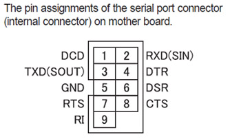 The pin assignments of the serial port connector(internal connector) on mother board.