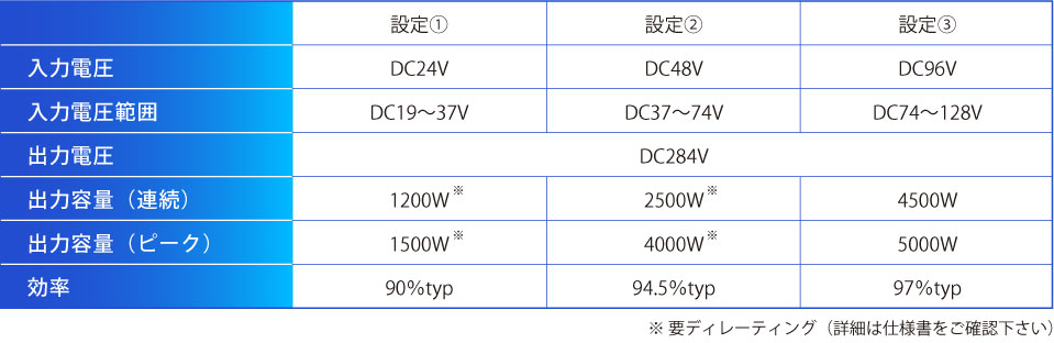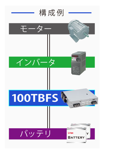 一方、小容量〜大容量までラインナップしているACモーターは、モーターを駆動させるための汎用インバータやサーボアンプがDC280V近辺の電圧を入力できる製品が存在します。100TBFS-2500-280は電池電圧(24V、48V、96V等)をインバータが動作するDC280V付近まで昇圧することができるため、バッテリによりACモーターを動作させることが可能になります。 これにより使用できるモーターの選択肢が広がり、DCモーターではラインナップが少ない大型のモーターもバッテリで駆動することが可能です。 |