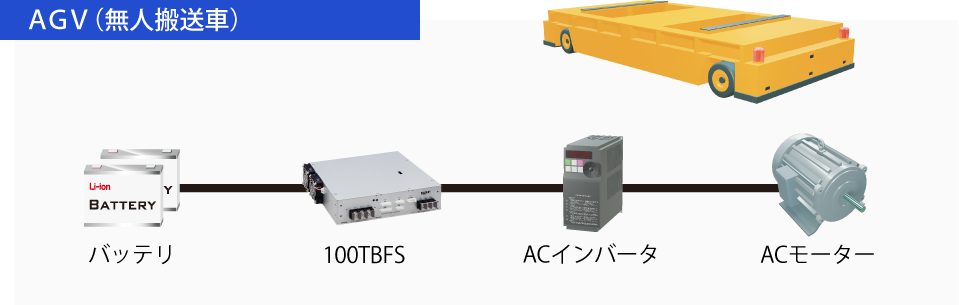 バッテリ電圧をインバータ、サーボアンプ(サーボドライバ)が動作可能な電圧まで昇圧することで、 ACモーターでAGVを動作させることができます。 |