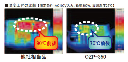 他社相当品と比較して約6%の効率差で、電力損失は約55%削減した省エネ電源です。(AC230V入力時)