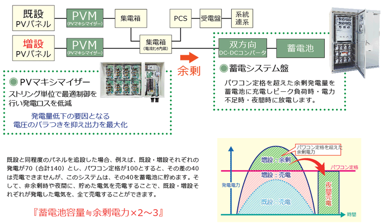 ニプロンの余剰蓄電ソリューションシステムは、PVマキシマイザーの接続によって、影・端数を気にせずパネルの増設が可能となり、 既存システムでの売電収入アップを実現し、パワコン定格を超える余剰分の電力は蓄電システム盤によって蓄電池へ充電し、 非余剰時(低発電時、夜間など)に放電させ、電力を無駄なく売電することが可能です。