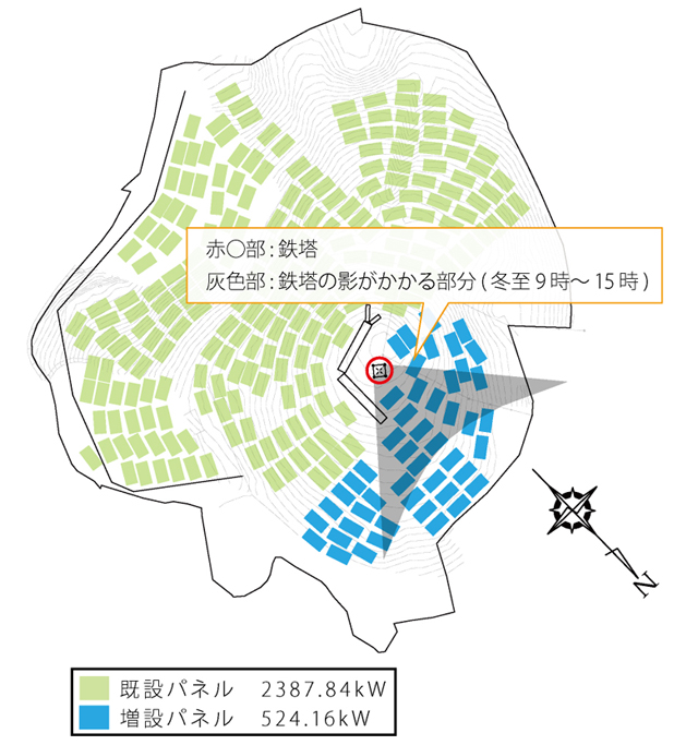 発電所中央に設置されている鉄塔の影がかかるパネルがあることなどの懸念があり、十分な発電量が得られない恐れがありました。