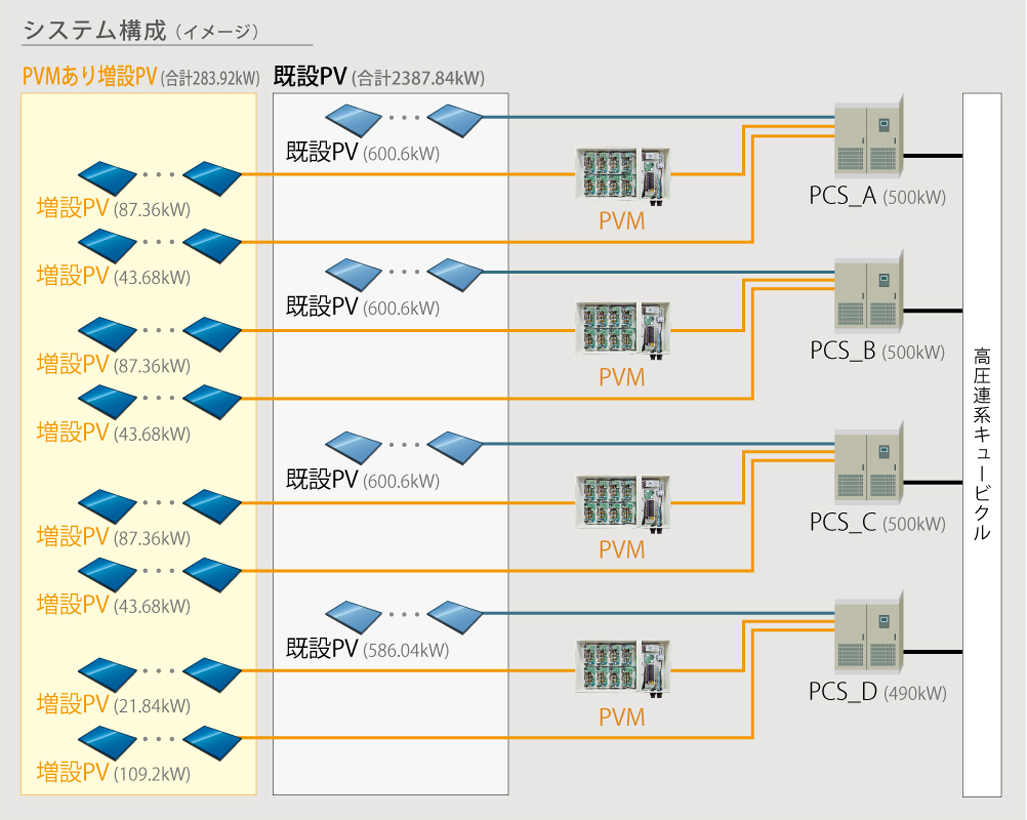 パネル増設にあたり、増設部は北面であり設置条件が悪い(発電量低下)こと、セントラルPCSの一括制御による既設部の発電量ロス、