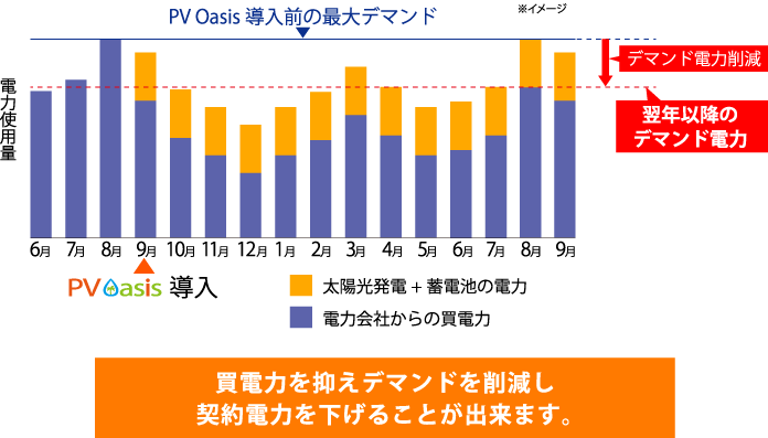 そこで、ピーク需要に対しPV Oasisを活用することで買電力を平滑化します。